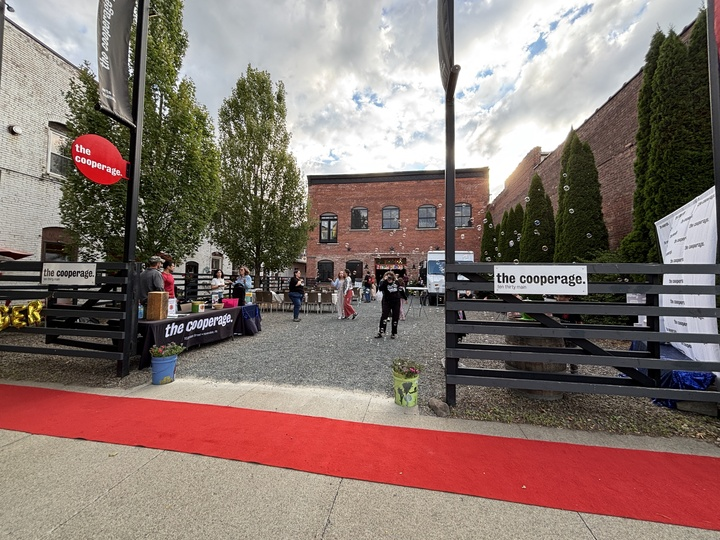 The main entrance to The Cooperage is set back from the sidewalk on Main Street. It is accessed by traversing a ‘pocket park’ filled with pea gravel. If you use wheels or have accessibility needs, please come to the side door, along the alley to the left of the building for a paved entry! We are currently pursuing funding to create a paved entrance right to our main entrance and hope to be able to fully welcome all of our guests through the front doors by fall 2026!