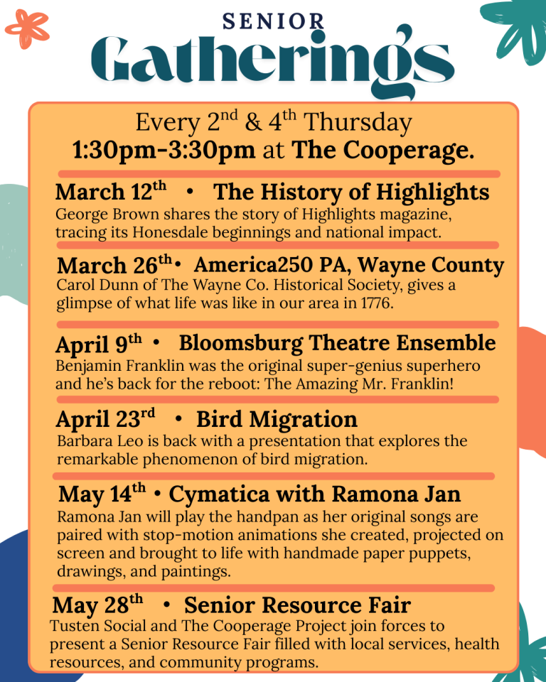 Recognizing the need for more consistent senior engagement across the Upper Delaware region, as well as seizing an opportunity to uplift one another’s community endeavors, we are coordinating their senior offerings—ensuring that older adults in the region now have a weekly opportunity for connection, enrichment, and fun. Tusten Social’s popular “Sage Sessions,” held on the first and third Thursdays of the month (1:30-3:30pm at the Delaware Valley Arts Alliance), are now complemented by The Cooperage’s Senior Gatherings on the second and fourth Thursdays, 1:30-3:30pm at The Cooperage. Both programs are free and require no RSVP.